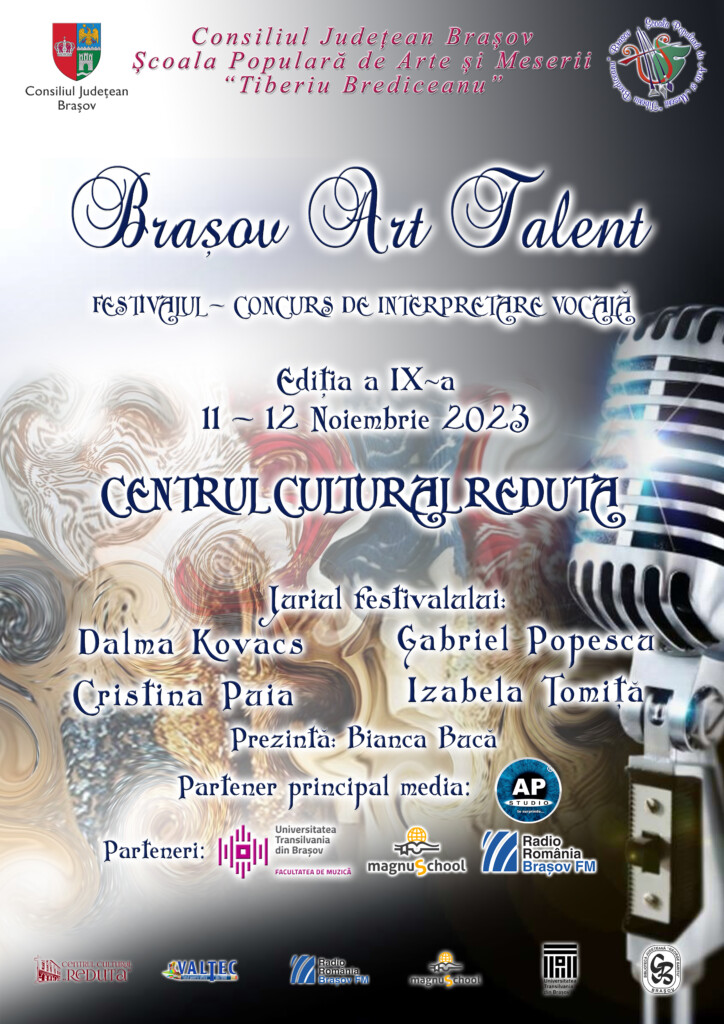 Şcoala Populară de Arte şi Meserii ”Tiberiu Brediceanu” din Braşov organizează cea de a IX-a ediție a Festivalului Concurs ”Brașov Art Talent” destinat tinerilor interpreți de muzică ușoară și muzică populară.