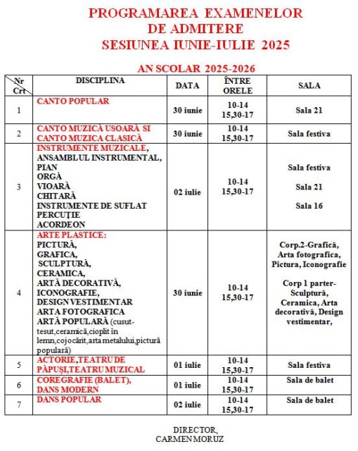 EXAMENELE DE ADMITERE SE VOR DESFASURA IN PERIOADA 30 IUNIE-2 IULIE 2025 LA SEDIUL SCOLII IAR REZULTATELE SE VOR AFISA IN 08 IULIE 2025