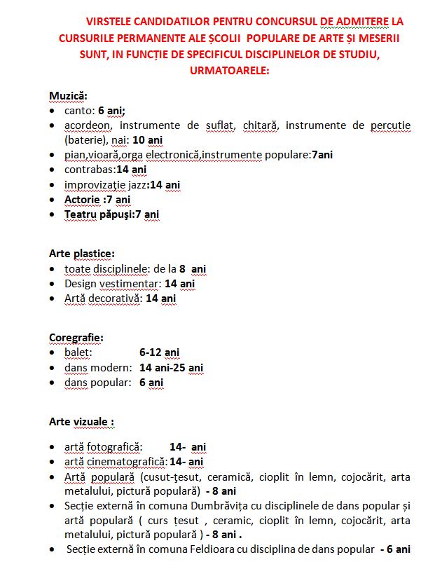 2. VĂRSTELE CANDIDATILOR PENTRU CONCURSUL DE ADMITERE LA CURSURILE PERMANENTE ALE ȘCOLII POPULARE DE ARTE ȘI MESERII SUNT, IN FUNCȚIE DE SPECIFICUL DISCIPLINELOR DE STUDIU, URMATOARELE: